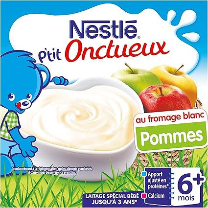 Fromage blanc bebe 4 mois-Dès 6 mois Les 4 pots 2,02 euros / Ingrédients, allergènes, additifs, composition nutritionnelle, labels, origine des ingrédients et informations du produit NESTLE P'TIT ONCTUEUX au Fromage Blanc Pêche 4 x 100g Dès 6 mois 400 g